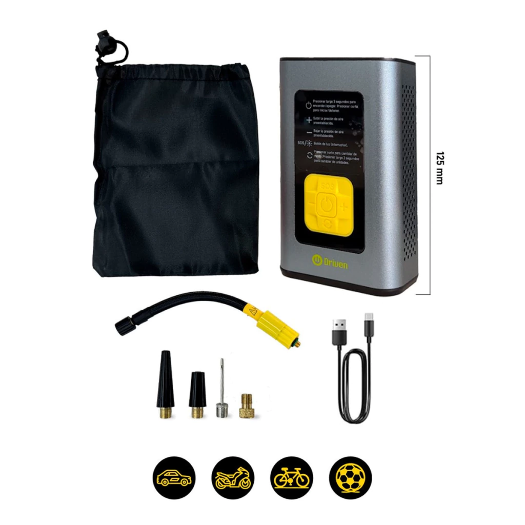 • Accesorios: Viene con un cable de carga USB Tipo C, estuche de guardado y picos adaptadores para diferentes tipos de válvulas y pelotas.